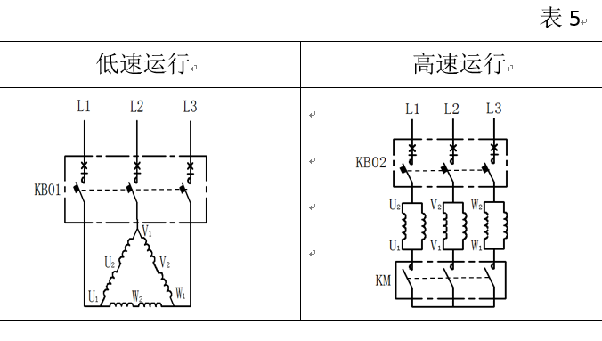 許多場合需要使用雙速電動機如一般工業建筑、民用建筑、排風兼排煙風機。通常需要兩種風機轉速分別用于正常(平時低速排風)和緊急情況(如發生火災需要高速排煙),為此需要采用雙速控制器去控制兩種轉速的電動機。基于兩臺KB0輔以適當的接觸器等構成KB0D雙速控制器裝置,其控制雙速電動機繞組的接線方式見表5