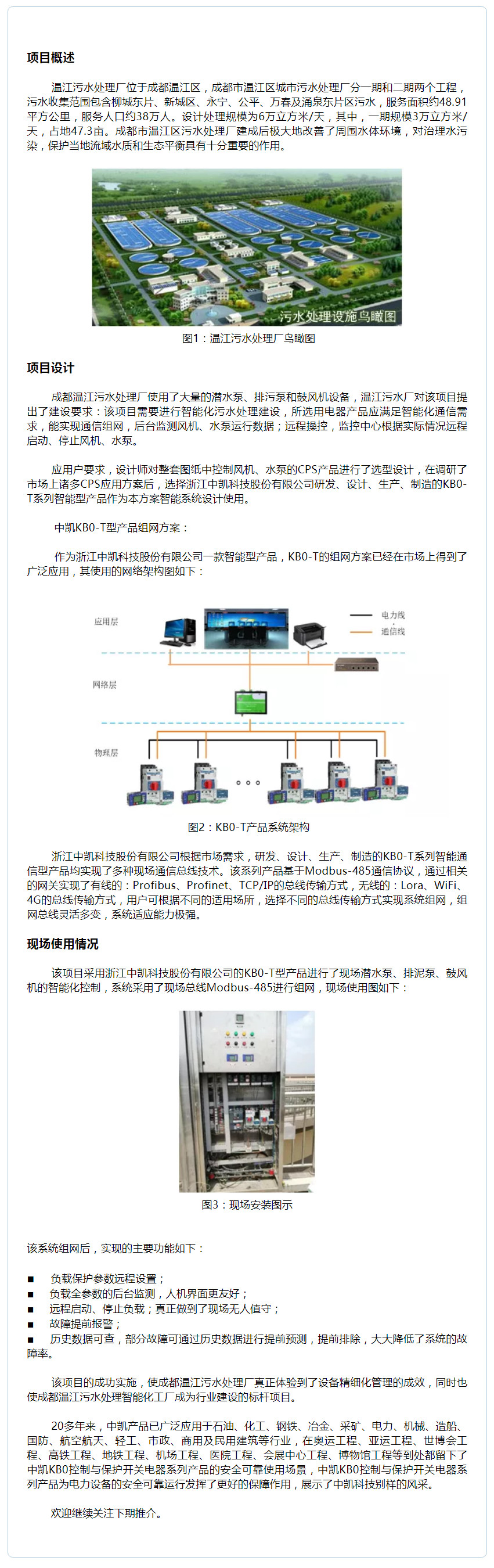 中凱KB0-T智能型產品在成都溫江污水處理管理系統中的應用
