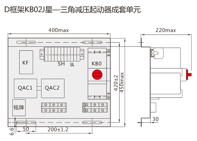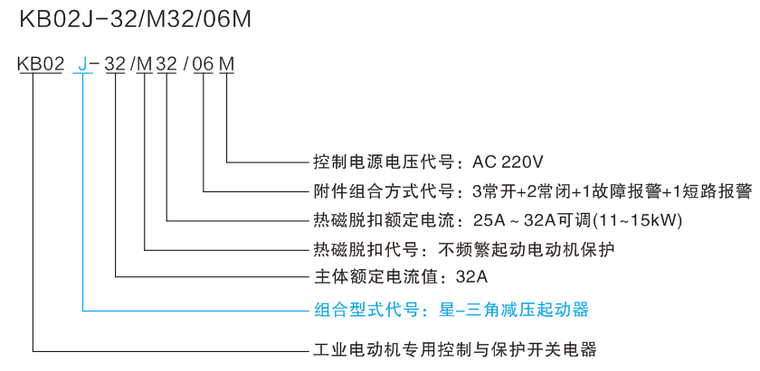 適用于電動機星-三角減壓起動的控制與保護,以KB02產品作為主開關,與接觸器、時間繼電器、電氣聯鎖及控制回路組合構成星-三角減壓起動的控制與保護裝置。