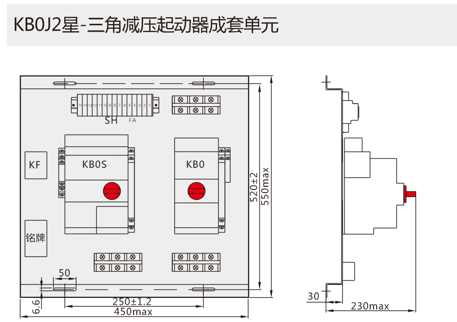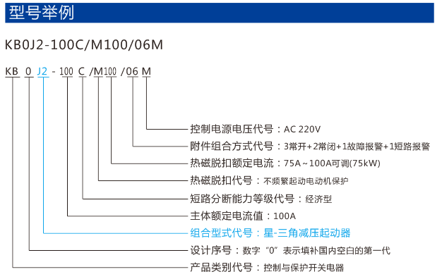 KB0作為主開關,與適當的時間繼電器、電氣聯鎖、機械聯鎖等附件組合,構成Y-△減壓起動器成套單元KB0J2(以KB0-F消防型產品作為主開關,可構成消防型Y-△減壓起動器成套單元KB0J2-F, 具有過負荷僅報警不跳閘,短路時報警+跳閘的功能。)可實現110kW及以下的電動機的Y-△減壓起動控制與保護。