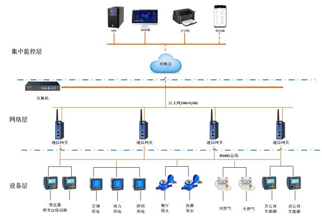 中凱能耗監控系統基于中凱云平臺,現場能耗監測設備進行能耗數據采集,通過智能網關組網,將數據上傳至中凱云平臺。web端及移動端app通過訪問云服務器同步數據,監控系統實現數據監測、分析、評估等功能。